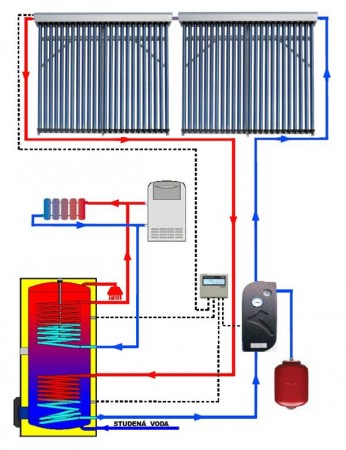 2) Systém pro ohřev TUV a přitápění (2ks kolektor 24-trubicový + bojler se dvěma výměníky)